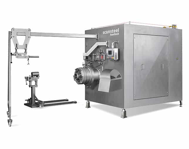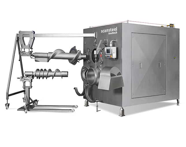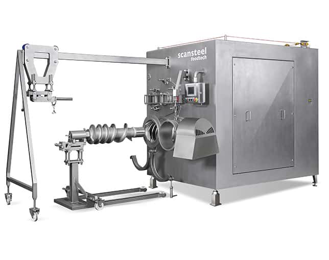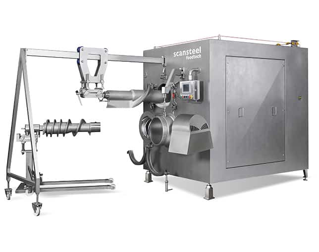 Minimum product stress provides ground end products with reduced fat separation during cooking and improved drying and curing abilities. Variable speed drives for both feeding and grinding worm/auger provide a balanced and constant flow to the cutting set, single or double.
