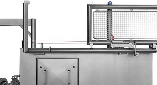 The MG 200 can be manufactured with optional protection guard for platform, moveable and secured with safety switch. The infeed hopper is secured with a tripwire. Safety devices will stop the machine maximum 4 seconds after having been triggered.