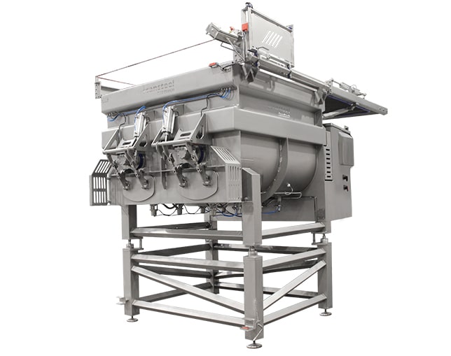 The scansteel foodtech® Twin Shaft Mixers with Vacuum are ideal for mixing applications that require air evacuation prior to emulsifying, filling/stuffing, or forming. With cooling, it is also ideal for (heavy) extended products such as meat balls, luncheon meat, and patties. The unique mixing action with high peripheral wing speed gives superior protein extraction, uniform distribution of spices, additives and liquids, and provides efficient salt activation of the salt soluble meat proteins (protein extraction).