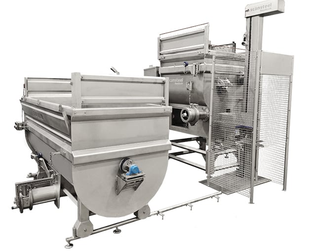 scansteel foodtech® ContiPump series comes in many different infeed hopper designs. Below shows a ContiPump 250 being fed by a scansteel foodtech Mixer/Grinder for pet food snack manufacturing.