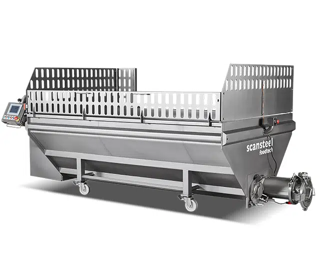 The scansteel foodtech® ContiPump series has been designed in such a way that the unit can function as a stand alone pump or, as shown above, can be designed to fully be integrated as part of an integrated solution with the scansteel foodtech® ContiPump and the scansteel foodtech® mixer series. In order to secure full hygiene solutions as well as having full access to both the mixer(s) and ContiPump for inspection/maintenance. The scansteel foodtech® ContiPumps can be placed on a “rail system” which makes it fully possible for a person to separate the ContiPump and mixer. At the same time, during production, the ContiPump is secure in “running position” in such a way that the ContiPump cannot be moved.