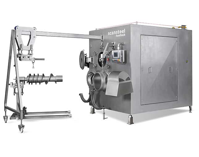 Minimum product stress provides ground end products with reduced fat separation during cooking and improved drying and curing abilities. Variable speed drives for both feeding and grinding worm/auger provide a balanced and constant flow to the cutting set, single or double.