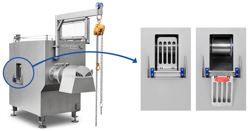 A prime example of scansteel foodtech’s hygienic design is given by the hygienic zone positioned between the worm/auger and the gear box. Hygienic zone shown in running position (closed) and in cleaning/inspection position. When opened, the grinder cannot be started until the guard has been positioned in closed position.