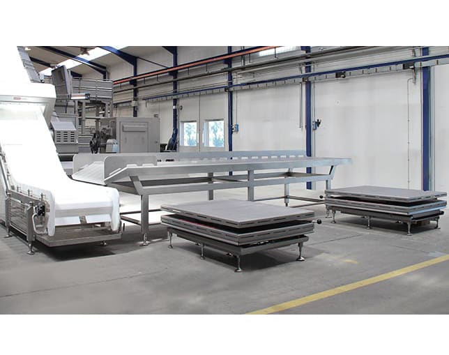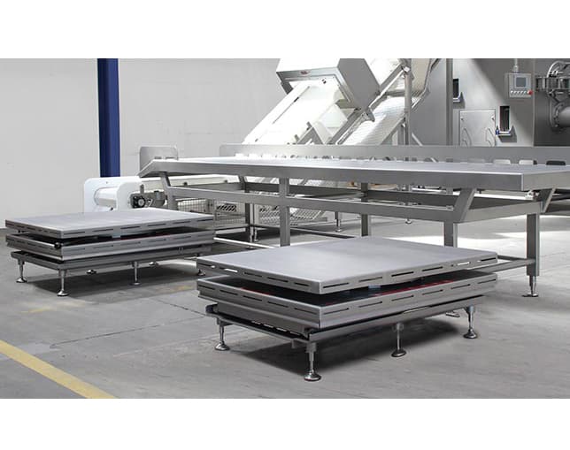 Belt Conveyor with Unpacking station with 2 (two) lifting tables for ergonomics, right side.
