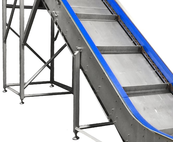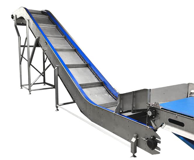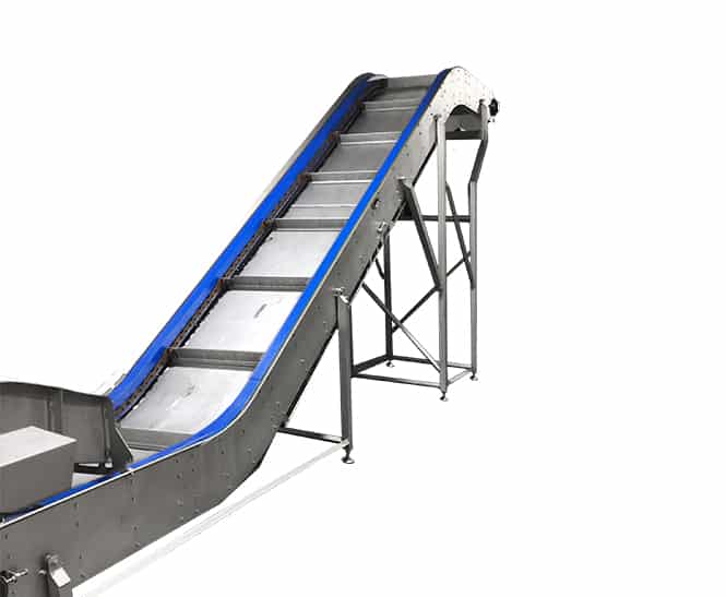 The scansteel foodtech® Inclined Chain Bulk Conveyor is designed with a pitch chain system in each side of the bulk conveyor and equipped with stainless steel guides/flights for transportation of the product. The Inclined Chain Bulk Conveyor can be equipped with infeed chute if used in combination with other belt conveyor installations.