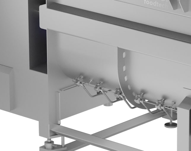 Two mixing wings positioned at two different heights from floor level. 250 Litres to 7500 Litres mixing container volumes. The square shaped mixing container contributes to scansteel foodtech’s very short mixing times. 1 unit frequency converter controls the mixing wing speed (depending on the customer specifications). Please note that the scansteel foodtech TSMI Intermeshing Mixer is equipped with 2 (two) mixing wing directions: For gentle mixing to intensive stirring. Two outlet gates for fast discharge or, alternatively, one large centre discharge gate. Vacuum version (V) for control of pre-mix density, curing/tumbling, and protein extraction.