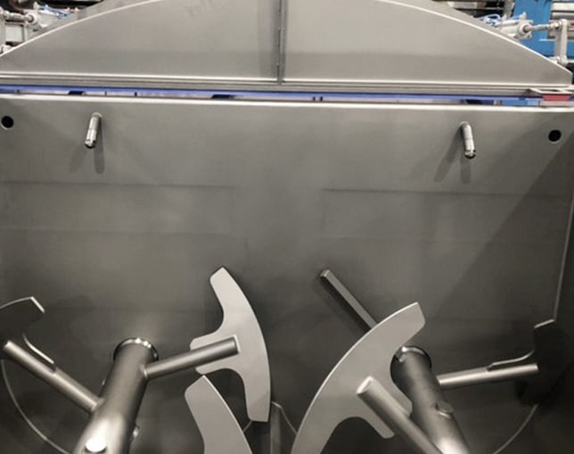 The scansteel foodtech® Twin Shaft Mixers Intermeshing with Vacuum are ideal for mixing applications that require air evacuation prior to emulsifying, filling/stuffing, or forming. With cooling, it is also ideal for (heavy) extended products such as meat balls, luncheon meat, and patties. The unique mixing action with high peripheral wing speed gives superior protein extraction, uniform distribution of spices, additives and liquids, and provides efficient salt activation of the salt soluble meat proteins (protein extraction).