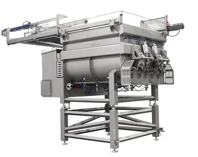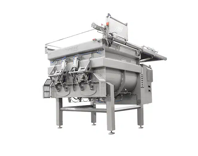 The scansteel foodtech® Twin Shaft Mixers with Vacuum are ideal for mixing applications that require air evacuation prior to emulsifying, filling/stuffing, or forming. With cooling, it is also ideal for (heavy) extended products such as meat balls, luncheon meat, and patties. The unique mixing action with high peripheral wing speed gives superior protein extraction, uniform distribution of spices, additives and liquids, and provides efficient salt activation of the salt soluble meat proteins (protein extraction).
