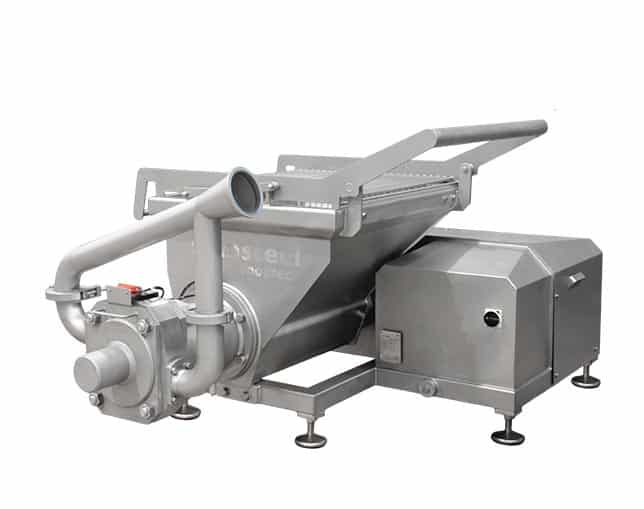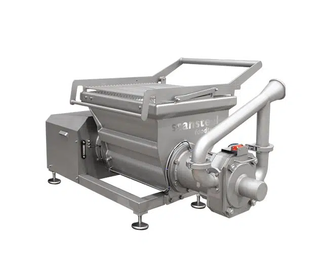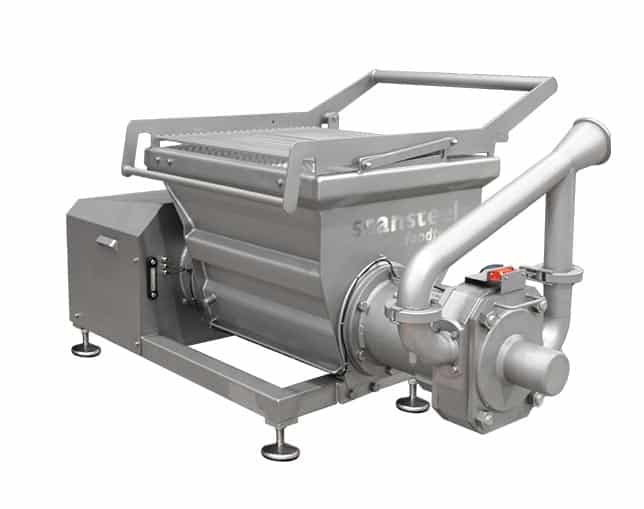 The scansteel foodtech® SuperPump series comprises 3 (three) different pump sizes. Correct choice of pump depends on several factors such as, but not limited to, pump capacity, material to be pumped, temperature, viscosity, and particle size – from pre-ground meat raw material to half a pork carcass. One significant feature is the double discharge outlet which dramatically minimizes (eliminates) fluctuations in pump capacity. Motor for pumps is designed according to pump application.