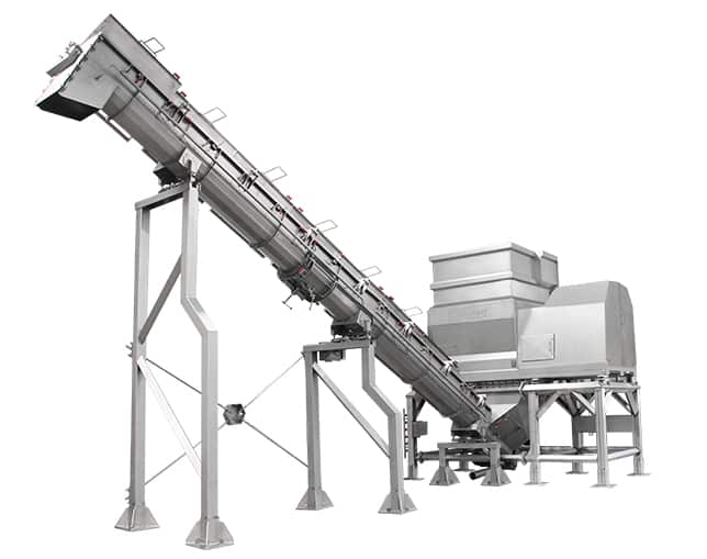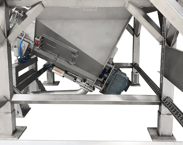 Whole Pallet Crusher, WPC 2000 perfectly integrates with complete pet food processing lines. WPC 2000 shown with a scansteel foodtech® inclined screw conveyor with built-in buffer capacity for a crushed whole pallet of meat raw materials.